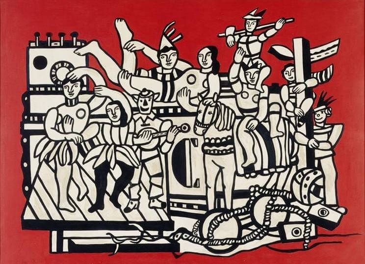 Dieses Werk stammt aus der Zeit, in der Léger danach strebte, eine für alle zugängliche Kunst zu schaffen, inspiriert von Spektakel, Fest und dem Leben des Volkes. Er wandte sich damals von industriellen Themen ab und interessierte sich zunehmend für Freizeit, Zirkus und kollektive Szenen. Der einheitliche rote Hintergrund verstärkt die visuelle Wirkung und erinnert an Theaterkulissen oder Plakate, was sein Interesse an einer monumentalen, farbenfrohen und für das Publikum unmittelbar verständlichen Kunst verdeutlicht.